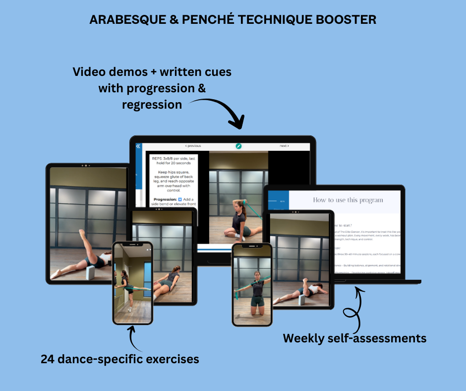 It’s not enough to be strong in the gym. This program targets dance-specific movement patterns so your power, stability, and control show up in every jump, turn, extension, and balance.